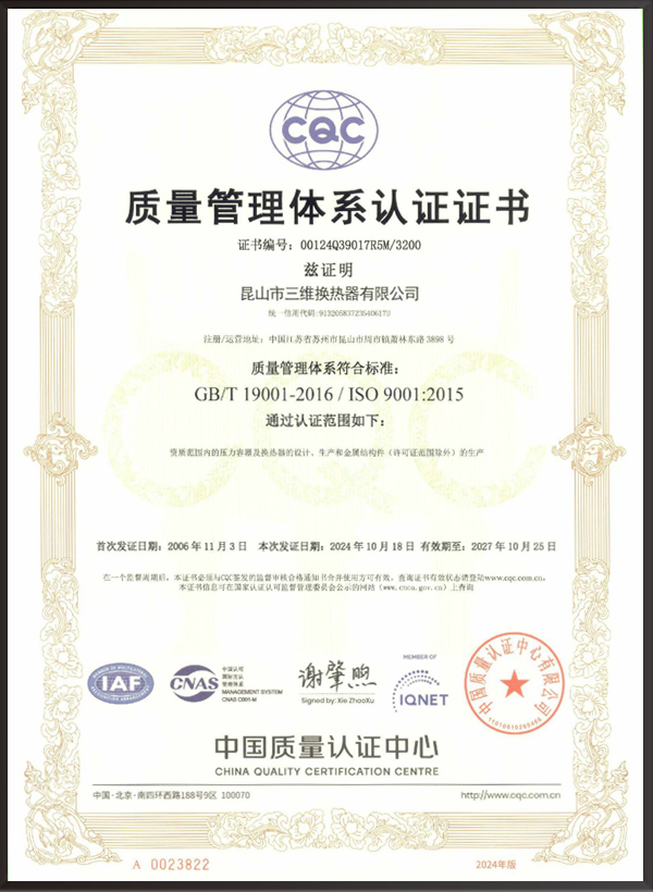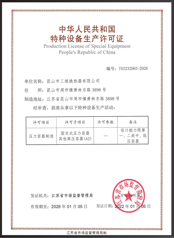 昆山市三維換熱器有限公司注冊(cè)資本5000萬(wàn)元,資產(chǎn)2.1億元,公司地址位于江蘇省昆山市周市鎮(zhèn)蕭林東路3898號(hào),法人代表為顧安生,公司設(shè)有技術(shù)部、生產(chǎn)部、檢驗(yàn)部。